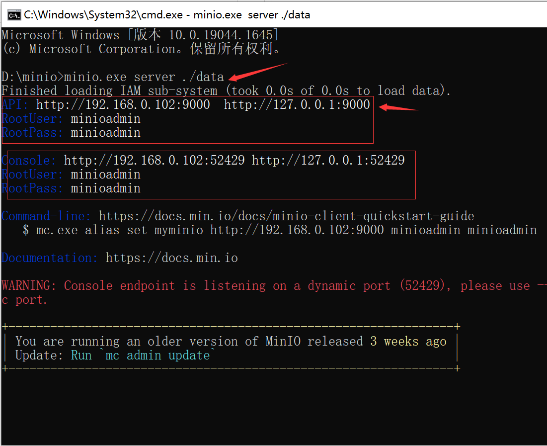 我们启动后控制台会输出如下信息,首先第一部分中是我们和Minio,进程通信的服务地址和用户名密码